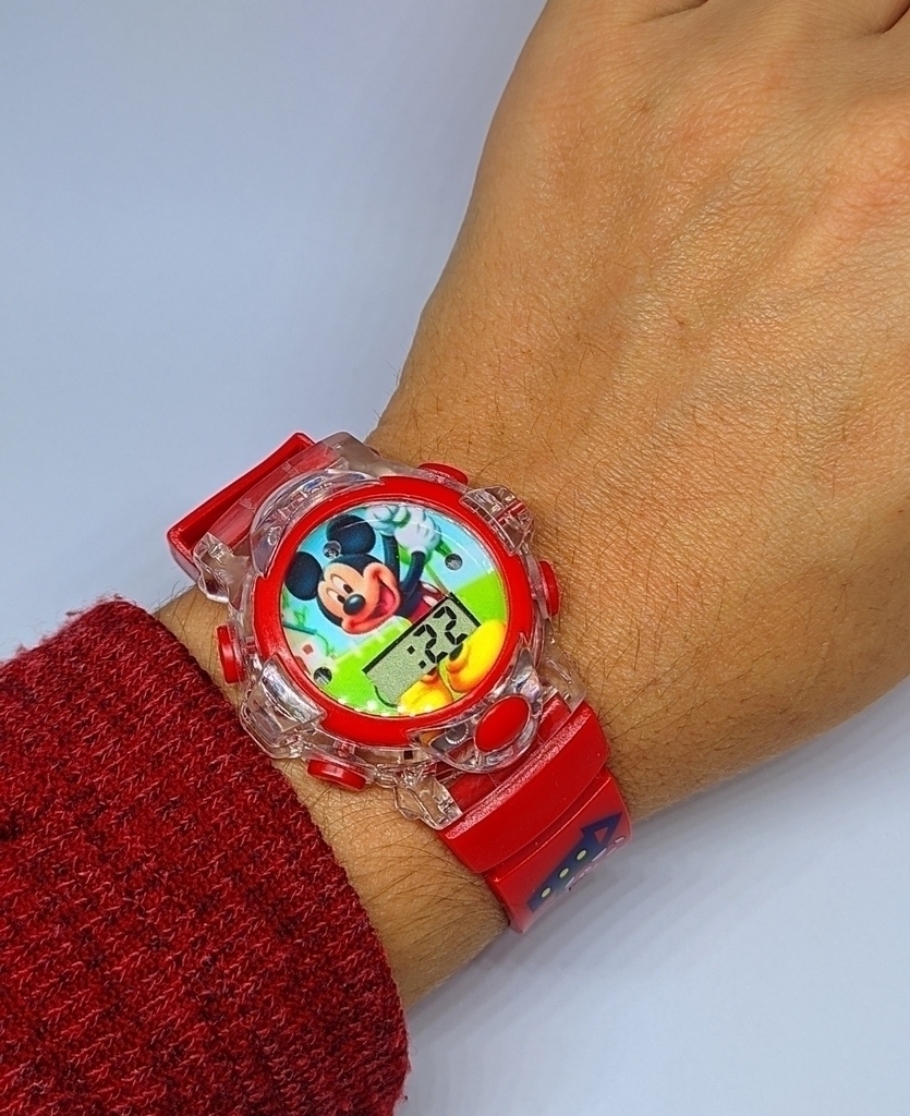 Recomendação, acima dos 2 anos Relógio com 3,5 cm Pulseira de 22cm , com regulagem Pulseira em silicone antialérgica. Funções; horas digital , data e, conta com umas luzes coloridas de led que, fica piscando . OBS; NÃO É A PROVA D'ÁGUA GARANTIA DE 30 DIAS, PARA DEFEITO DE FÁBRICA